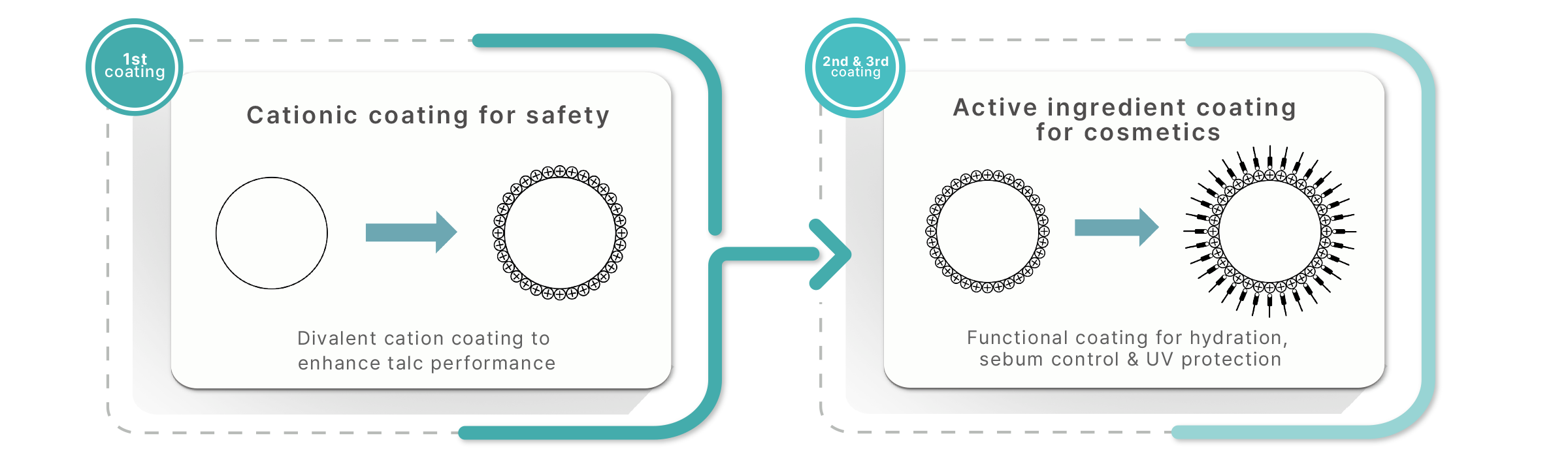 A primary cationic coating improves stability and particle uniformity, while secondary and tertiary coatings add functions like moisturization, sebum control, and UV protection.